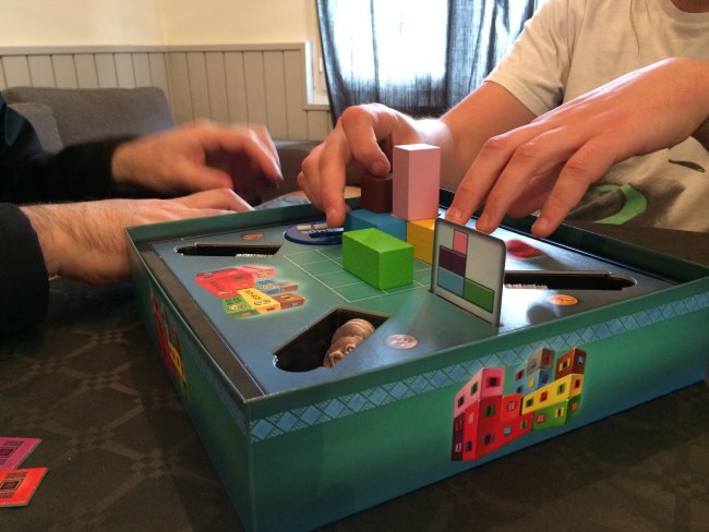 Encore un jeu d’un genre que je ne connaissais pas. Je suis en admiration devant l’inspiration des auteurs. Malgré que je ne sois pas le public visé, la partie était plaisante. « En équipe de deux joueurs, différente d’un tour à l’autre, deux partenaires doivent unir leur sens de l’observation afin de recréer une construction donnée. Et puisque le temps est compté, il faut compléter son défi le plus rapidement possible afin de marquer un maximum de points. Une fois le défi terminé, une nouvelle équipe est formée et un autre défi commence. »