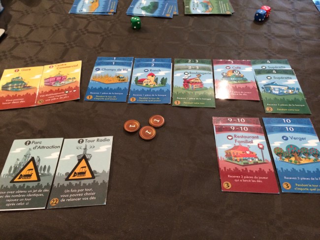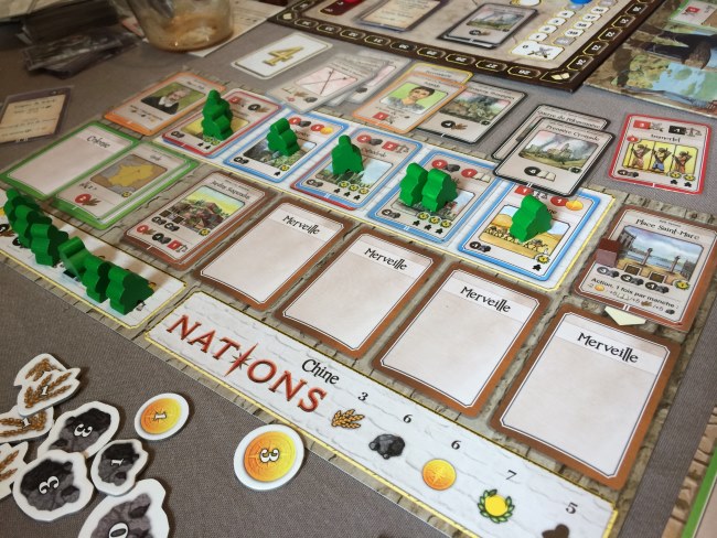 Et bien oui, en une seule ère j’ai mis ma Nation en faillite… j’aurais pu sauver ma nation à un moment donné mais j’avais déjà abandonné et je n’avais pas la carte miracle. Le jeu est vraiment très riche mais quand on joue dans les derniers et que les cartes bâtiments ne sortent pas beaucoup, c’est une lutte perdue d’avance. J’ai donc regardé les autres jouer pendant près de 3h. Je vais quand même laisser une chance supplémentaire à ce jeu et y rejouer. Mais décidément ce week-end n’était pas mon week-end, cerveau ramolli au possible par le boulot et l’envie de jouer mais pas de vaincre non plus, ça fait pas bon ménage. En tous les cas, je tiens à remercier Nico, Michel et Michael pour leur patience car je pense avoir été bien chiante sur ce jeu, ceci dit , c’est assez difficile de regarder les autres jouer :p