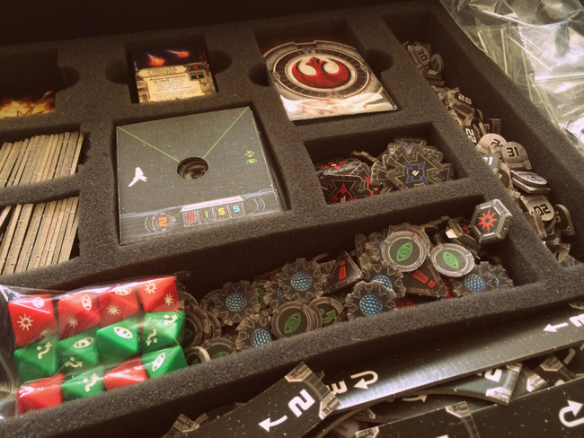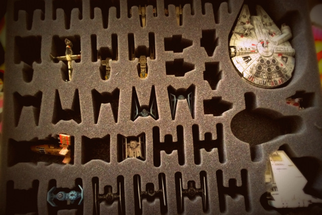 La première chose qui m’a séduit c’est le matériel. Des figurines de vaisseau bien sculptées, joliment peintes, très détaillées, avec lesquelles on a immédiatement envie de jouer. Le tout accompagné de cartes de pilotes, de dégâts et d’améliorations, ainsi que de cadrans d’ordres, de gabarits de déplacement, d’une règle de portée, et d’une profusion de jetons divers. La boite de base, qui contient un chasseur X-Wing et deux Tie, est déjà bien remplie. Mais si vous envisagez d’acquérir d’autres vaisseaux par la suite, je vous conseille chaudement d’investir dans une mallette de transport type Pack 216, avec des mousses spécialement découpées pour accueillir vos figurines, ainsi que tout le matériel qui va avec.
