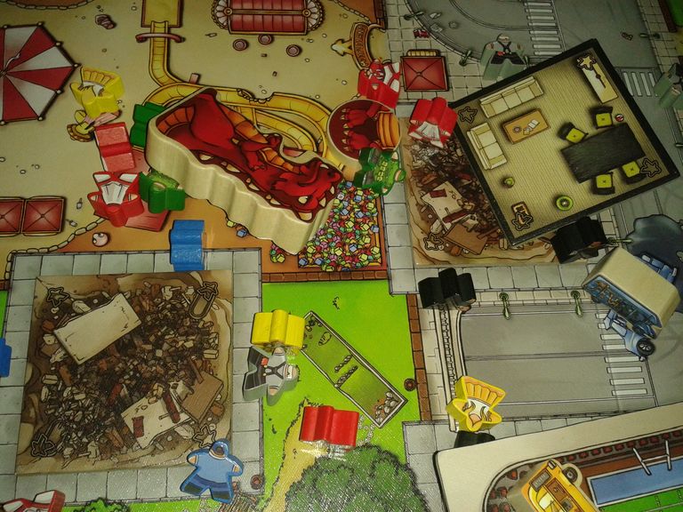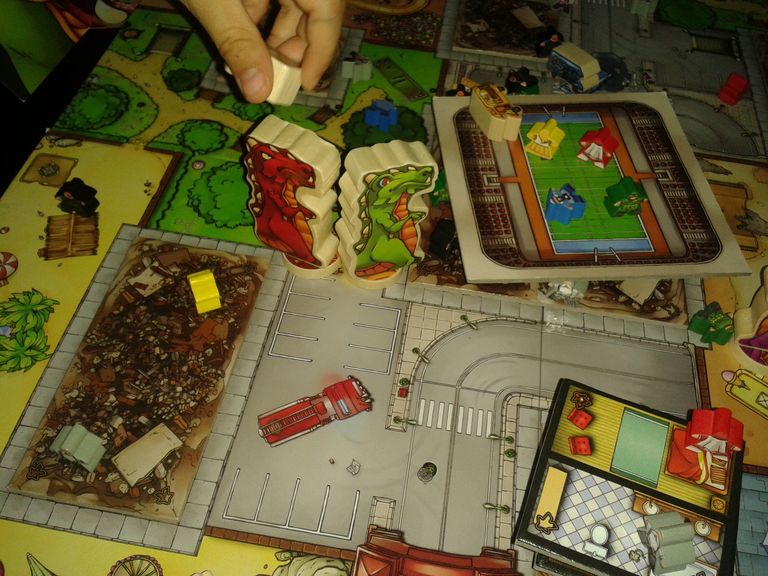 A tour de rôle, les joueurs vont réaliser 2 actions aux choix avec leur monstre : déplacement, démolition, projection de véhicules, souffle. Il faudra choisir entre détruire les bâtiments, attaquer les autres joueurs en leur balançant des véhicules… la partie s’arrête lorsque le dernier bâtiment est détruit.
