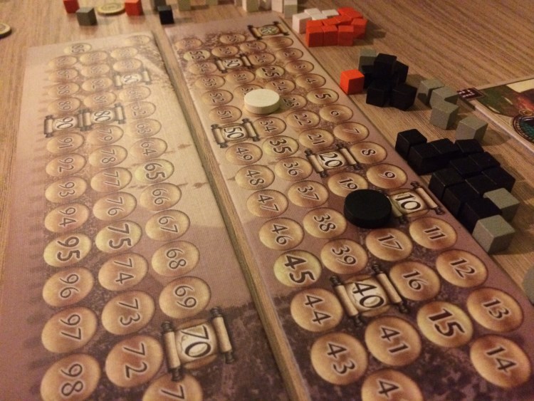 Les principales sources de points sont la construction du mur (plus vous cumulez de bout de mur, plus le gain est violent), la construction de la ville ou bien le départ à la retraite de vos ouvriers.