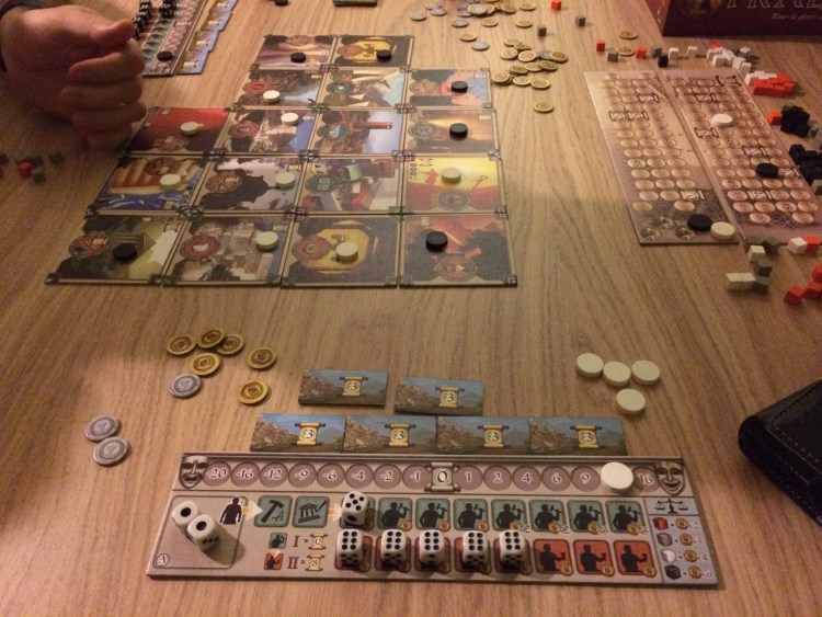 J’ai pu faire 3 parties, à 2 joueurs à chaque fois par contre. Ça tourne magnifiquement bien mais il faut admettre que le début du jeu est long et répétitif. Puis la gestion grandissante des ouvriers, ressources et « quartiers » de la ville donne de plus en plus d’intérêt au jeu. On apprécie d’autant plus les coups, les combos et les points qu’on engrange. Par contre, il a été dit que la tuile permettant de rendre actif un ouvrier à la retraite est particulièrement cheatée (pour reprendre les termes du jeu vidéo). Oui, sur les 3 parties, les gagnants avaient cette tuile, mais les scores ont toujours été très serrés quand même. Donc je ne sais pas trop quoi en dire, ou alors on devrait baisser son coût d’utilisation pour ceux qui veulent utiliser la tuile. C’est sûr que c’est une tuile non négligeable celle-ci.