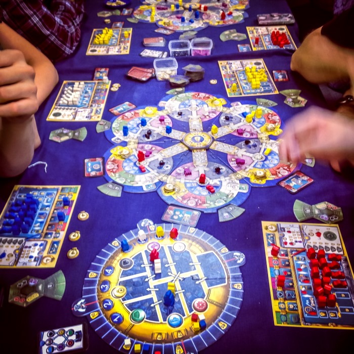 A l’ouverture des portes jeudi, je me retrouve assis à une table 5 mètres après l’entrée, sur l’invitation de Thomas Cauet (Grunt) pour tester Witness chez Ystari. 30 secondes après déboule Cyril Demaegd, qui vient nous situer le contexte du jeu et quelques subtilités. En 1 minute, Essen devient alors concret pour moi, avec une entrée en matière rêvée !