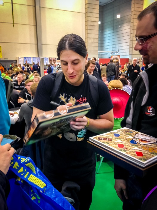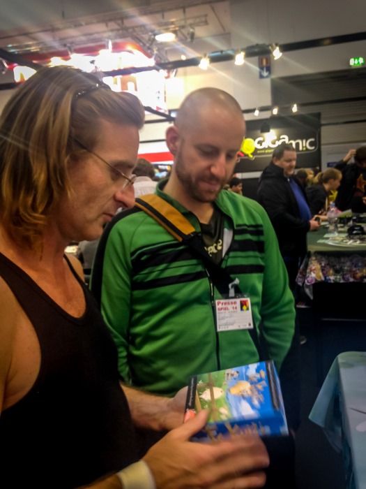 Le vendredi commence bien pour moi, après un footing de 10km dans les petites rues du Sud d’Essen. Je rejoins Gus, Fendoel, j’attends Micha. Pour bien attendre je retourne au stand de Ferti et je craque pour Complots et Vérona, trop beaux pour être abandonnés dans du carton. Je me promène toute la matinée en essayant d’occulter la pensée du supermarché géant. La bonne humeur des Coréens et de leur Bucket King 3D me font marrer, et je rejoins enfin Micha devant le stand de Blue Orange. Nous discutons avec Bruno Cathala [soupir de GeekLette] qui vient d’arriver, et attendons Vincent Dutrait et Ludovic Barbe pour une dédicace.