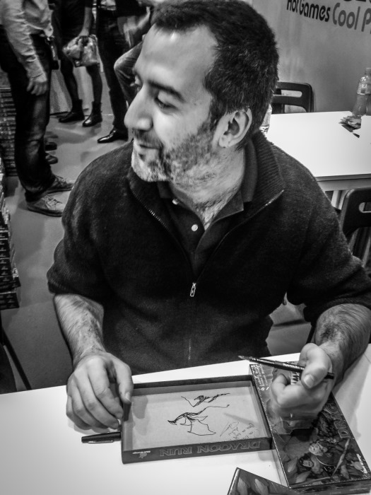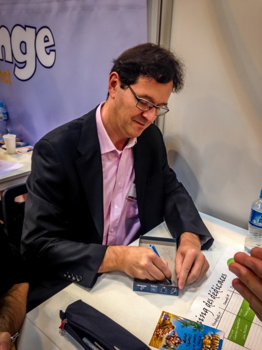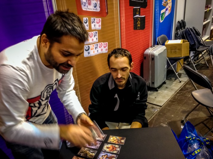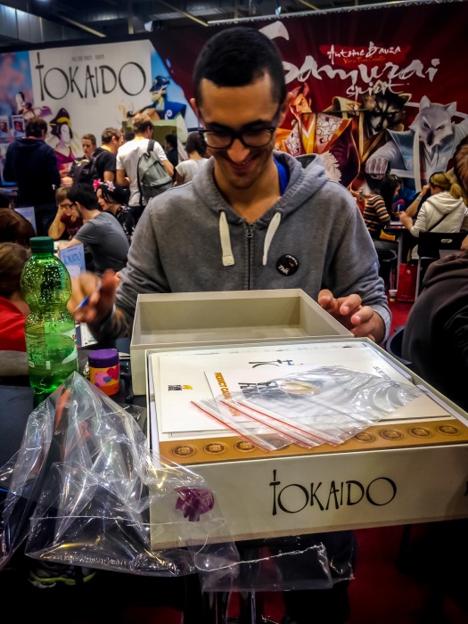 Une fois cela fait, nous sommes invités par l’auteur d’Abyss (avec Bruno Cathala) et de Wakanda entre autres, Charles Chevallier, à faire un tour du salon, lui qui n’a fait que bosser depuis jeudi. Nous nous exécutons sans peine, les kilomètres ne nous font pas peur ! Cette entrevue se révèlera fort instructive, Charles nous distillant de précieuses infos sur les rouages du monde du #j2s. En fin d’aprèm j’ai encore la chance de rencontrer Naïade, illustrateur incroyable de Tokaido, Seasons, Complots…Une belle personne, simple, accessible, avec un talent fou.