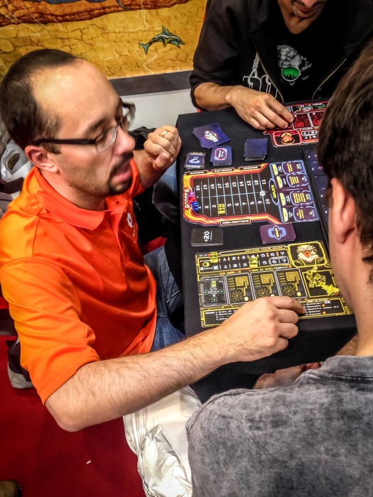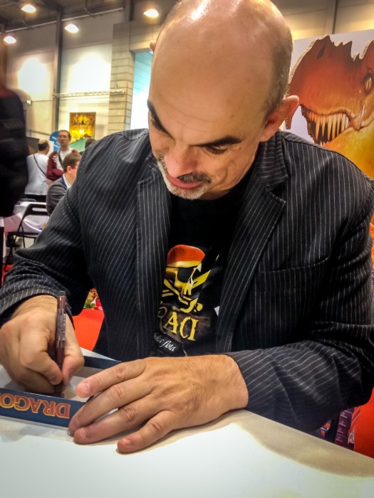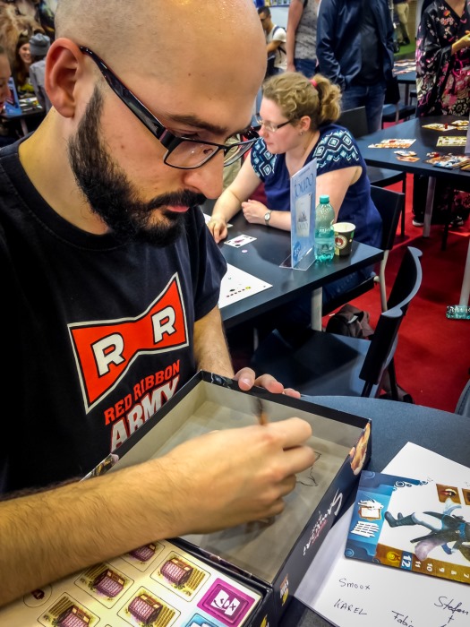 En fin d’aprèm je file chez Funforge pour récupérer mon Samurai Spirit, le faire dédicacer par Victor Perez Corbella, par ailleurs membre de l’armée du ruban rouge. Le stand Funforge est d’ailleurs un modèle de bon goût, avec les couv géantes de Samurai Spirit, Quantum et Tokaido, et des animatrices dans un kimono classieux.
