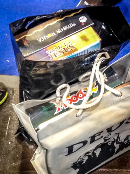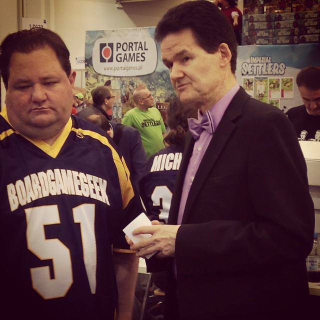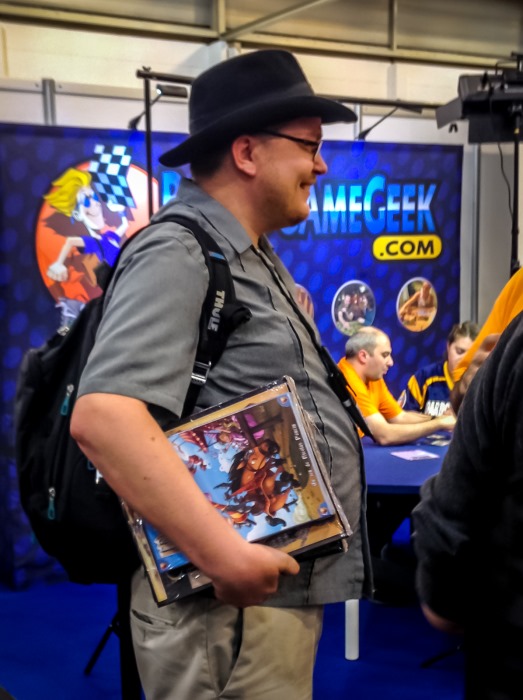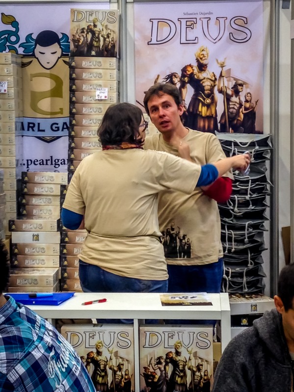 Au détour de stands, en flânant, je croise Reiner Knizia, Tom Vasel (avec un exemplaire de Walk to Jesus dans son sac LOL), le stand de Ludonaute qui ne désemplit pas. Je m’arrête aussi devant le système de classement BGG et me demande comment des gens ont pu voter le jeudi à 11h pour des gros jeux comme Terres d’Arle, m’enfin…