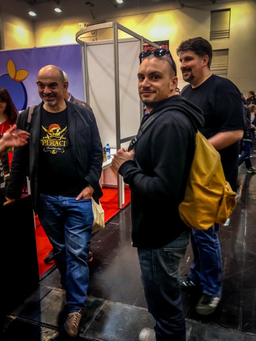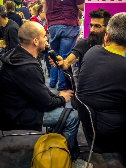Pendant que les autres se sustentent avec des animaux morts déguisés en curry-wurst, je rejoins Gus en pleine discussion avec Chris Boelinger. Ce dernier nous parle de ses futurs jeux et projets. Je fais connaissance aussi avec la team Ludovox, cool.