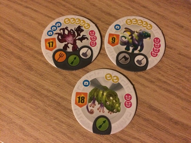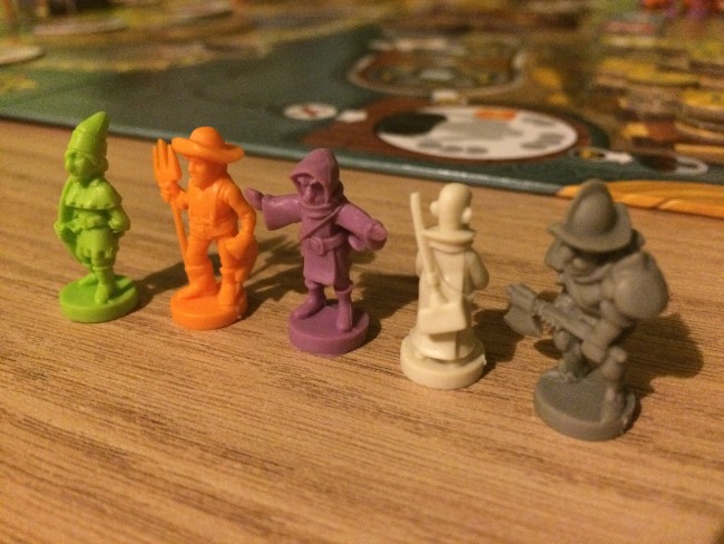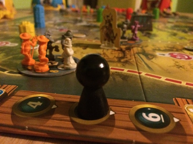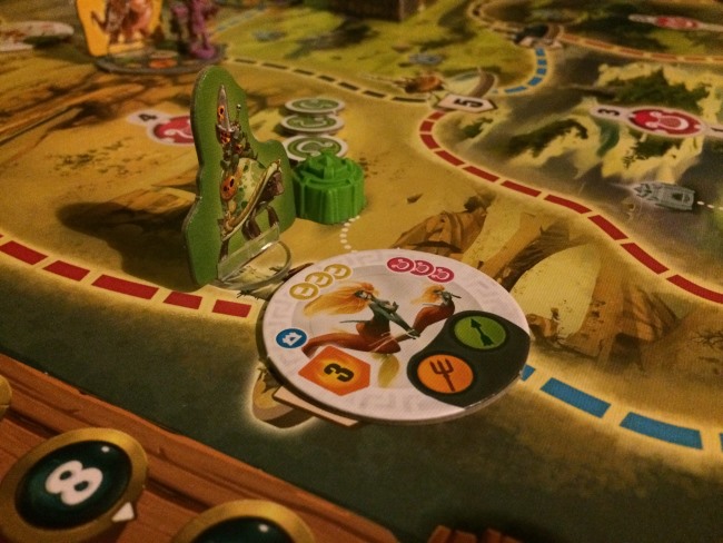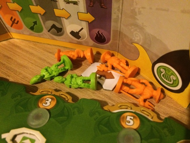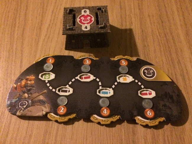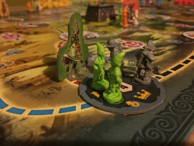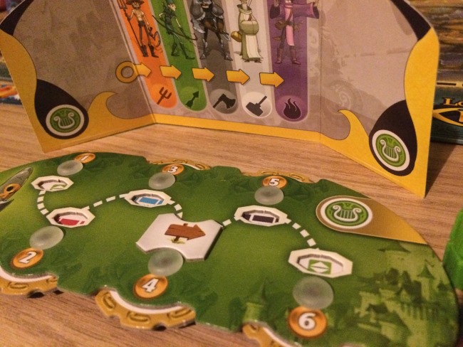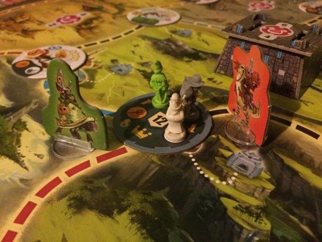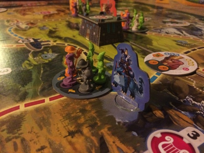 • Les joueurs dans l’ordre du tour exécute leur première action. Facile: le déplacement se fait sur les routes de couleur, le recrutement permet de récupérer une unité (milice paysanne, archers, infanteries, prêtres, mages), combattre signifie juste éliminer une menace en donnant les unités nécessaires et en choisissant 2 des 3 récompenses qu’offre la menace. Evidemment les 3 récompenses sont liées aux 3 critères de score. Ne rien faire est assez astucieux, car si vous êtes le premier à recruter dans une ville vous prenez l’unité la plus faible… parfois d’autres pensent que vous recruterez sans perdre de temps mais c’est faux héhé.