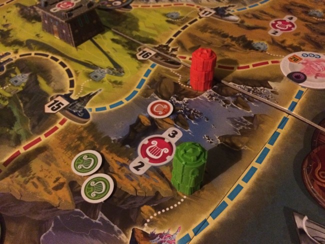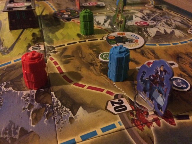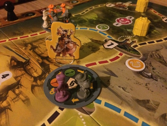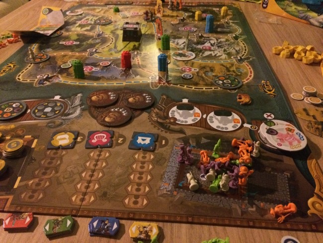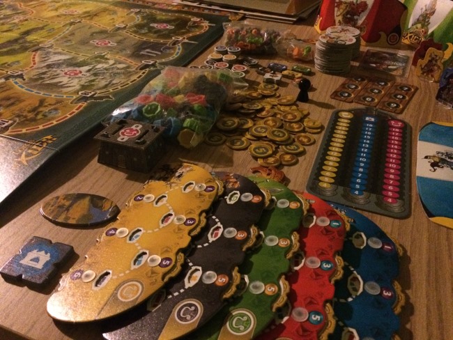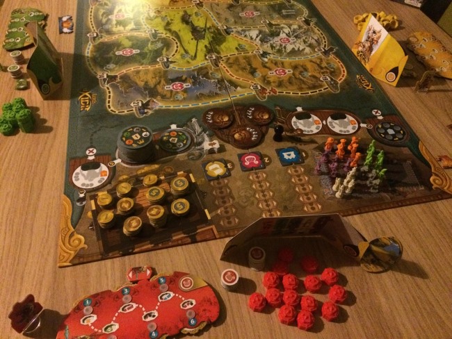 • après la mise en place de tout le très beau matériel  bien encombrant comme on aime, chaque joueur va se placer dans une cité de façon à être le mieux placé pour sa stratégie de déplacement.