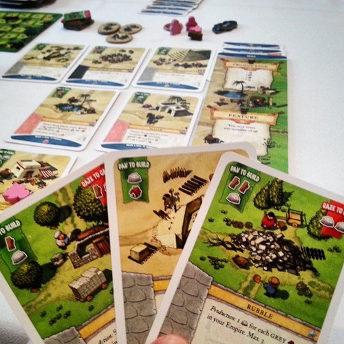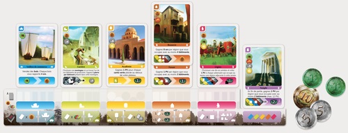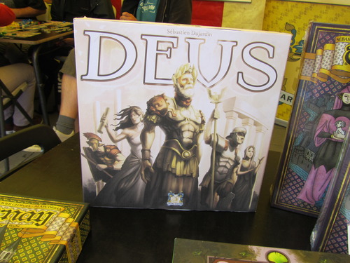 Le prochain Pearl Games, Deus, s’explique très vite mais n’en reste pas moins profond. A votre tour de jeu, vous choisissez de construire un bâtiment / temple en payant son coût, en gagnant son pouvoir et en vous plaçant sur le plateau, ou bien vous choisissez de faire une offrande aux Dieux. Savoir quand faire une offrande semble être le sel du jeu. On peut aussi attaquer les villes voisines. Bref, mon coup de coeur de cette année je pense.