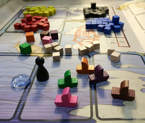 Nos amis de Japan Brand n’en sont pas à leur premier coup d’essai, leurs jeux s’arrachent dès le jeudi matin à Essen. J’ai râté les précommandes [mais comment t’as pu faire une chose pareille!!!]. Bref, je vais tenter d’aller les voir, leur faire les yeux doux et leur dire : atashi no namae wa Laurence desu… et là ils tomberont de leur chaise et on se mariera … euh je m’égare! Dans Isaribi, vous incarnez des pêcheurs qui pêchent (mouahaha) des poissons (logique), qui vendent leurs prises, améliorent leur bateau avant ou après l’avoir déplacé et j’en passe ! Izobretenik (correspondant ludique français installé au Japon) nous a évidemment donné l’eau à la bouche dans son article sur Tric Trac.