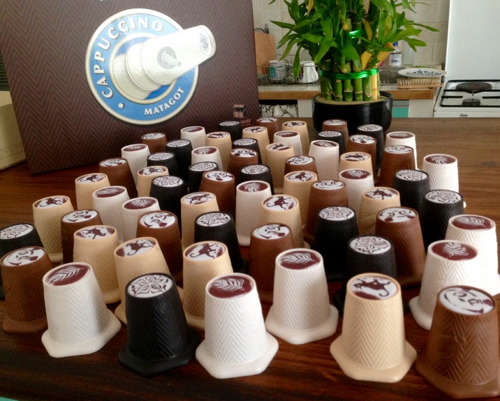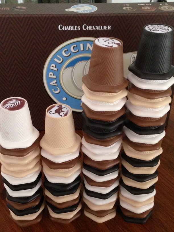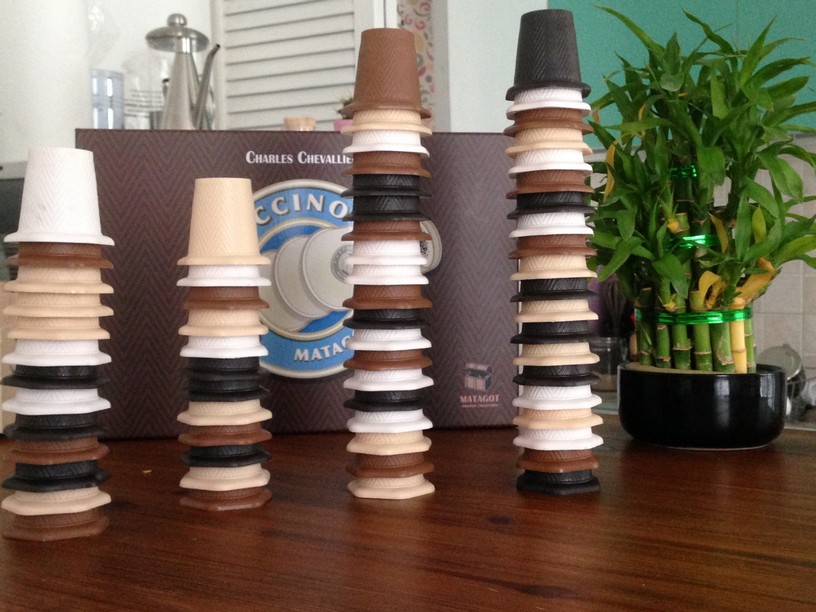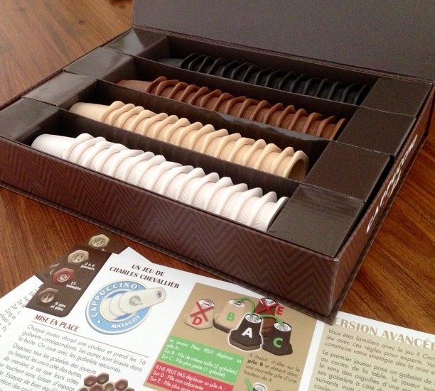 Matagot  a vraiment soigner l’édition pour donner à ce jeu abstrait une ambiance : le titre : Cappuccino, des couleurs : nuances de crème et de chocolat, la boîtes aimantées… Et surtout les gobelets en forme de dosettes. La qualité de fabrication est telle que petits et grands sont attirés par l’objet en lui-même et après une phrase d’explication, la fameuse : « saisissez vous d’un gobelet ou une pile de gobelets de votre couleur et posez sur n’importe quel gobelet ou pile adjacente de taille égale ou inférieure », on se met à jouer.