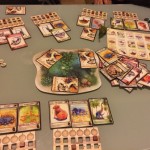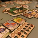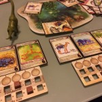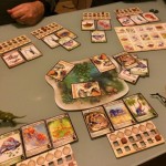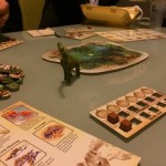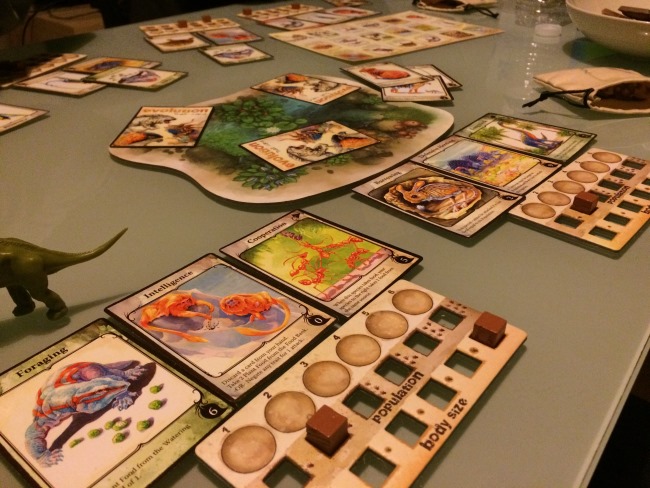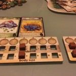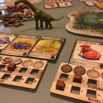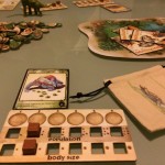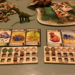 Et puis très vite les tours s’enchaînent et se ressemblent. On a l’impression que le jeu est interminable mais heureusement ce n’est qu’une impression. J’ai choisi des espèces herbivores à protéger sauf qu’en les protégeant je n’ai pas su les nourrir correctement mais mon dernier coup était pas si mal : j’ai baissé le nombre de nourriture au milieu (j’étais premier joueur), j’ai surprotégé mes espèces pour que les autres se mangent entre eux 🙂 M’enfin voilà jouissif sur le coup mais ça s’essouffle un peu tout de même rapidement. Ils disent qu’il y a 4000 façons d’améliorer ses espèces, certes, mais y’a des combos qui marchent FICHTREMENT bien quand même. C’est très difficile de se protéger tout en permettant d’obtenir plus de nourriture pour ses tribus. Du coup je me demande vraiment si les gagnants sont forcément les carnivores ? A vérifier !!