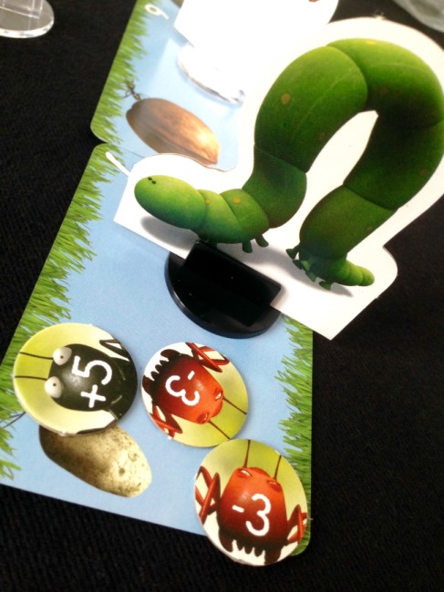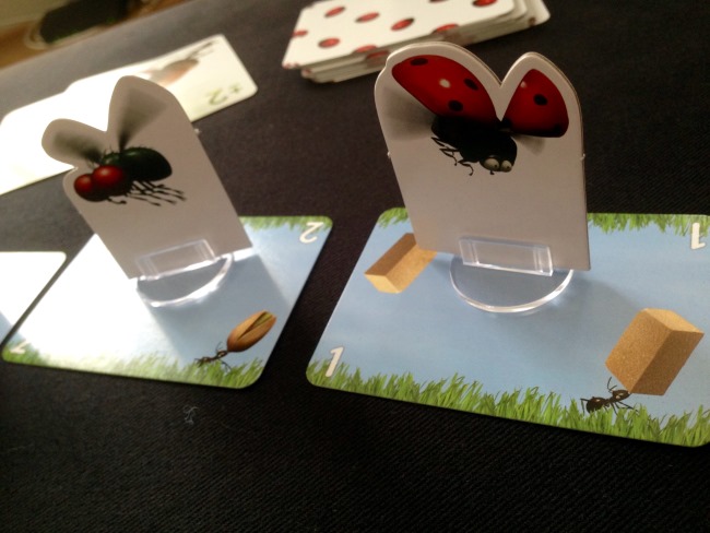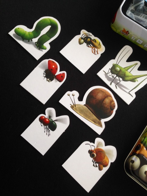 - la mise en place des animaux ne se fait pas au hasard, le premier joueur choisit un animal et le place au centre de la table. Le joueur suivant prend l’insecte de son choix et le place devant ou derrière le premier placé. Et ainsi de suite pour former une file constituée des 7 petites bestioles. Dans cet ordre, ils sont placés sur la piste…