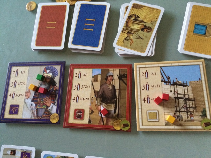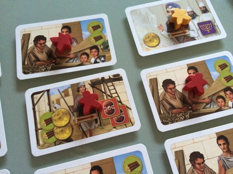 - ensuite le joueur va pouvoir jouer les actions de toutes les cartes de la colonne sous condition que la carte soit au dessus et qu’elle ait un ouvrier couché dessus. Par contre, cela coûte cher : pour jouer l’action des autres cartes de la colonne, vous devez donner une pièce d’or (par carte) à l’adversaire qui a son ouvrier couché sur la carte que vous souhaitez utiliser (ou à la banque si l’ouvrier couché est le vôtre).