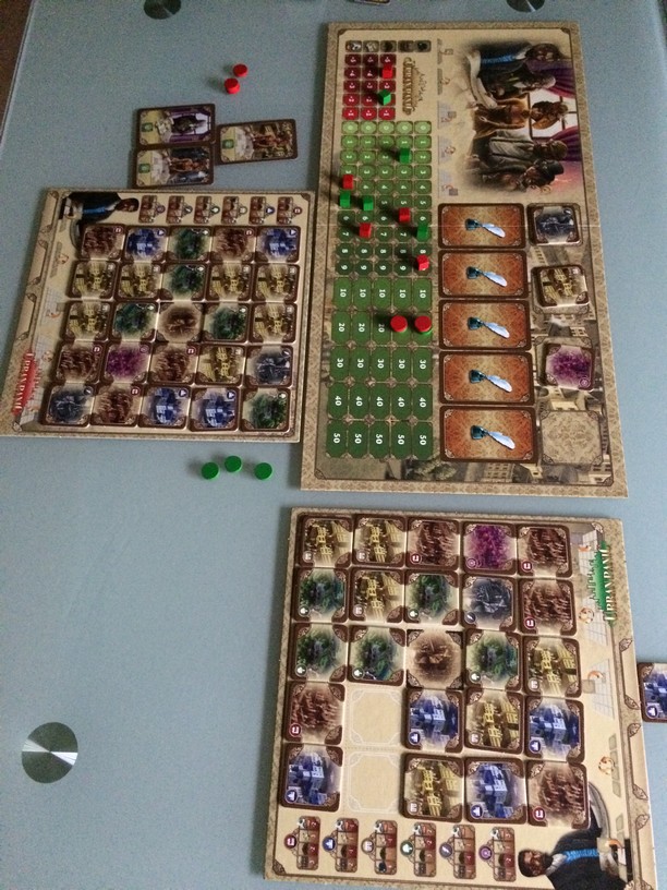 Derrière des illustrations qui forcent le respect se cache un jeu familial de pose de tuiles qui n’a pas le fun de Carcassonne (hors son mode real time) mais qui pousse le calcul aussi loin que lui. Les objectifs permettent d’orienter la partie, il y a en plus des limites à ne pas franchir (vous ne pouvez pas poser toujours les mêmes tuiles qui font remporter le plus de points car elles baissent vos points ailleurs et vous ne pouvais pas avoir moins de -5 sur vos marqueurs).