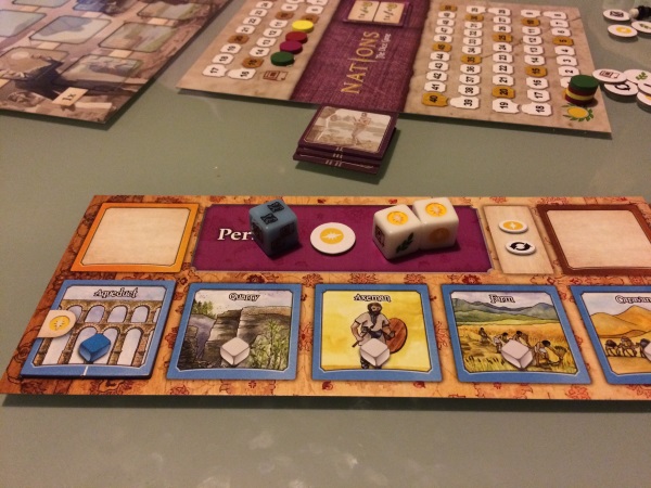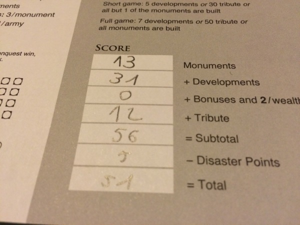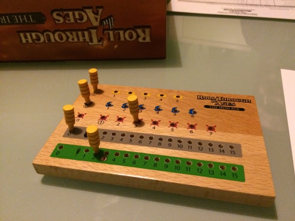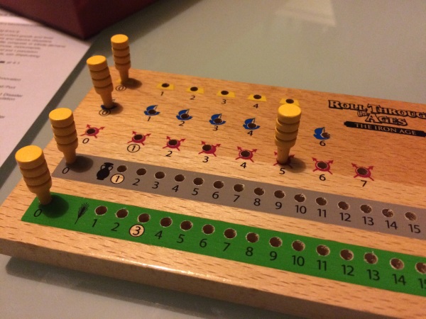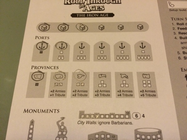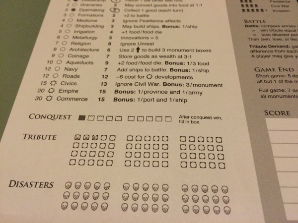 RTTA (pour les intimes) propose aux joueurs de développer leur civilisation en leur permettant de créer des provinces, de lever des armées, repousser les barbares, construire des ports et des bateaux, d’ériger des monuments, de faire face aux désastres et de nourrir le peuple. Rien que ça, oui oui, et le pire …. c’est que votre civilisation évolue sur une feuille de papier – en anglais – (quelle frustration mais quelle idée!!). Vos ressources, elles, sont gérées sur un plateau en bois magnifique comportant des trous qui peuvent accueillir vos marqueurs.