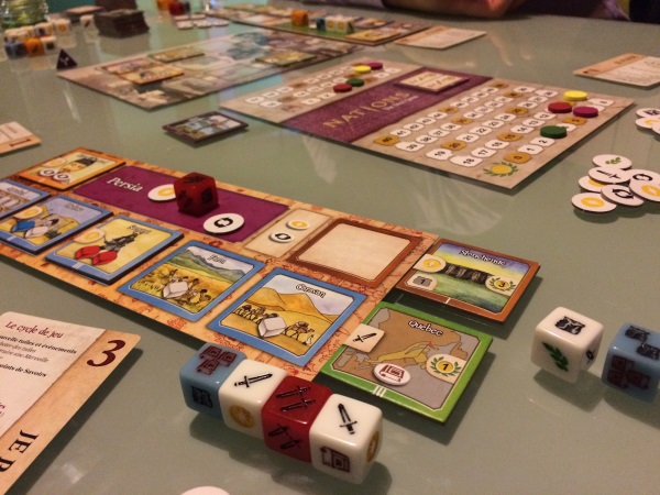 J’ai été fortement surprise par ce jeu. Il est agréable, riche, rapide et simple (mais pas simpliste, la citation éternelle du j2s). Il faut s’adapter aux dés ou c’est eux qui vont vous mener la vie dure. En plus, il se joue parfaitement à deux et même seul ! C’est peut-être là que ça coince, il y a peu d’interaction! Mais l’éditeur a trouvé comment résoudre ce petit incident : l’extension méditerranée permet aux joueurs de partager un plateau central. Malheureusement, l’extension était uniquement disponible pour ceux qui ont participé au financement du jeu.