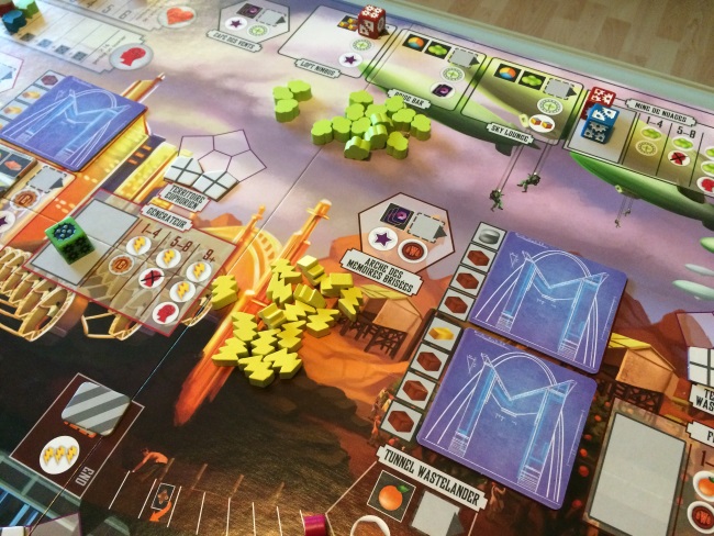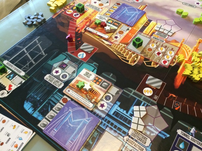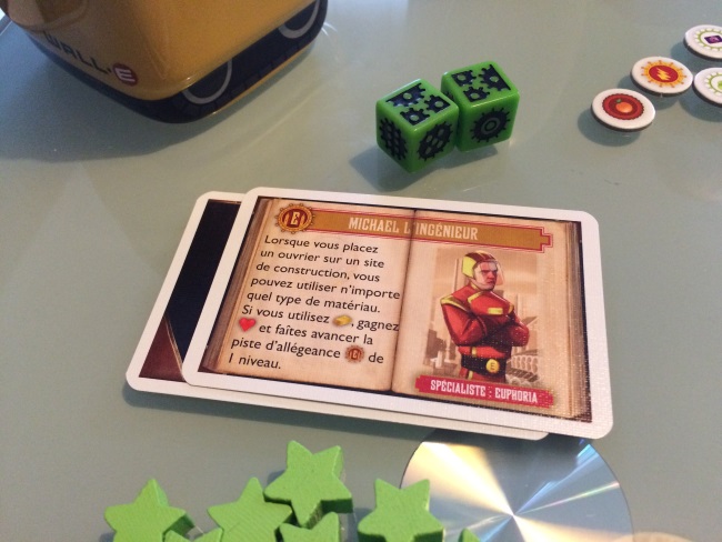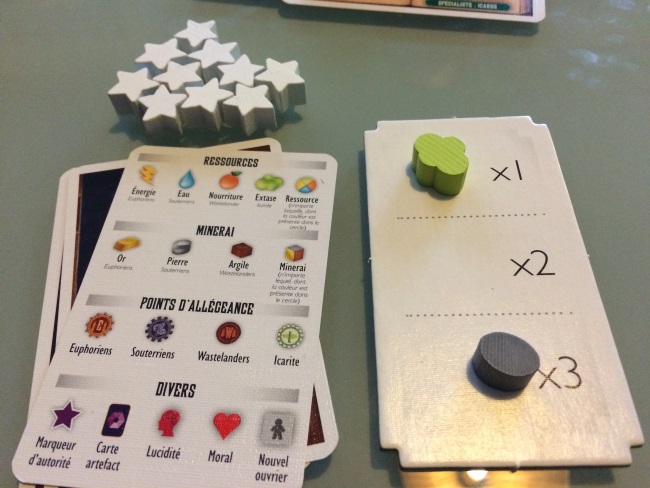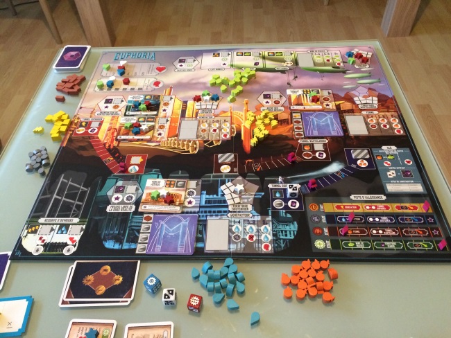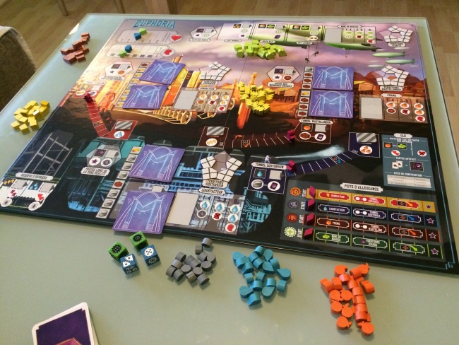 Bref, on n’est pas là pour parler de KS mais bien d’Euphoria : ce jeu au foutoir insolent mais ô combien jouissif pour les pousseurs de cubes et d’ouvriers ! Ici il est question de placement d’ouvriers (représentés par des dés dont la valeur est importante) et de gestions de ressources (électricité, eau, nourriture et confort) et minerais (argile, pierre, or). L’objectif est d’imposer son autorité dans différents domaines. Notre autorité est représentée par des étoiles, celui qui pose sa 10ème est déclaré vainqueur. Pour poser nos étoiles d’autorité, on devra placer nos ouvriers selon leur lucidité (chiffre sur le dé). Certaines factions auprès de qui nous prêtons allégeance nous permettront d’être plus rapide sur la récolte. Nos ouvriers permettront alors de récolter des ressources et des minerais, de construire des marchés qui nous donneront accès aussi à la pose d’étoiles, de creuser des tunnels pour espionner les autres mondes, …