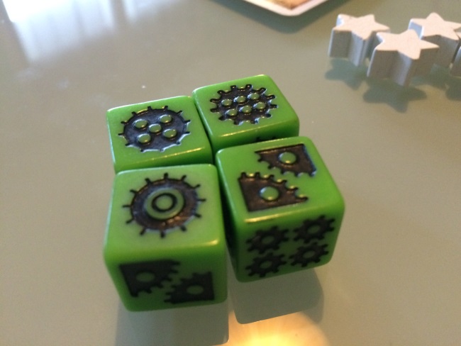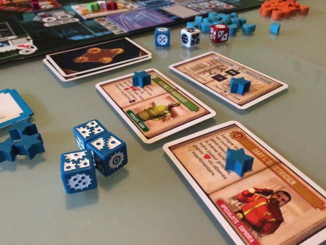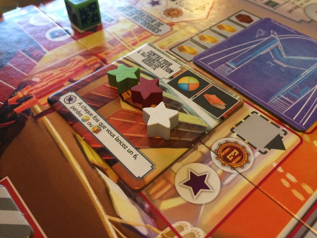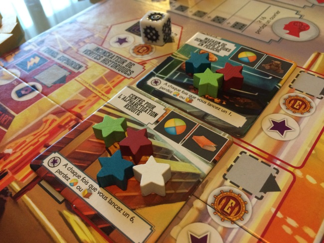 • le placement d’ouvriers est possible sur n’importe quel emplacement (soit vous chassez le dé précédent soit vous cumulez les points de lucidité des travailleurs des autres)…