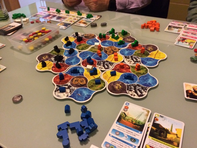 J’aime particulièrement la double action : poser une carte sur son plateau/jouer celles posées précédemment et construire son bâtiment sur le plateau principal où les batailles de territoires vont bon train.
