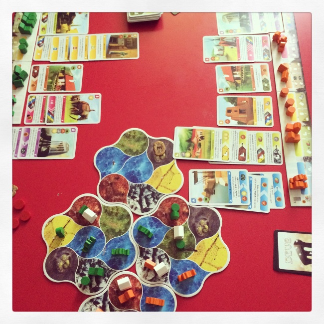 Voilà c’est tout bête et pourtant très riche !!! Autant le préciser de suite, il faut aimer les combo de cartes car c’est tout le sens du jeu. Ceux qui n’ont pas l’habitude de ce type de jeu, comme moi, trouveront dans Deus un très bon jeu avec une courbe d’apprentissage élevée. Ceux qui maîtrisent les combos par contre y trouveront un jeu simple et efficace à partager. Le jeu se joue en une heure, les règles sont claires, précises et rapides. Les activations de cartes (celles qu’on exécute lorsqu’on construit un bâtiment de même type) reste le sel du jeu et propose donc un très grand choix de stratégies. Ce qui est encore plus marquant cependant c’est la possibilité de bloquer l’expansion des autres sur le plateau principal (et modulable!). Ça fait grincer quelques dents au passage c’est toujours bon à prendre. Et la tension devient palpable lorsque la partie est bien entamée car le plateau principal commence à être occupé… et la place se fait rare.