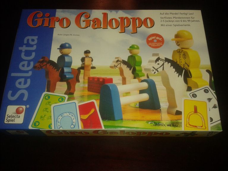 Envie d’un jeu qui change des petits chevaux ? Je vous propose l’excellent jeu « Giro Galoppo« , édité chez Selecta en 2006.