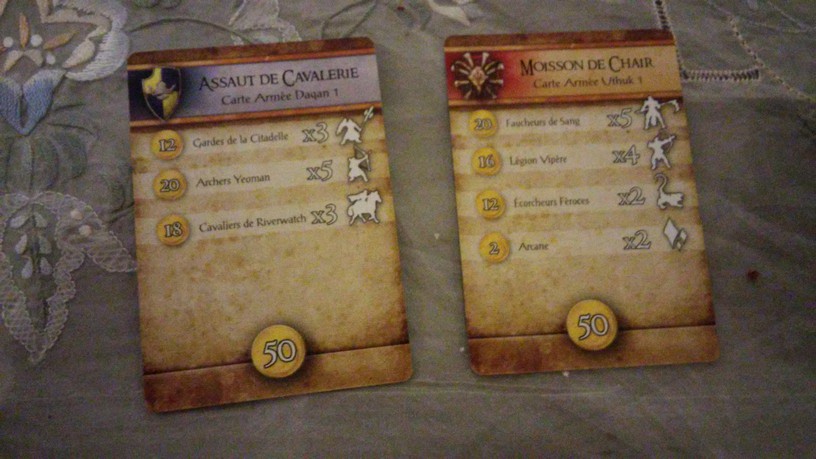• d’autre part, les joueurs vont placer stratégiquement des cartes représentant les unités de leur armée face cachée sur le (grand) plateau de jeu. Certaines cartes sont même des leurres. La valeur totale des armées doit être égale à 50 Points. Ainsi chacun peut se créer son armée comme il l’entend ou en appliquant l’un des exemples de composition d’armée proposé par le jeu.