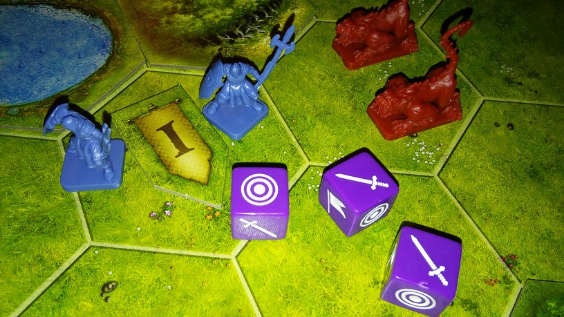 Voici d’ailleurs la 3ème bonne idée de cette réédition : La disparition du système de couleur des dés d’attaque qui était directement lié aux bannières propres à chaque type d’unités. Celles-ci étaient très instables et se détacher quelques fois. Ici les dés ont des symboles clairs et les bannières ont disparus : très bon choix éditorial !
