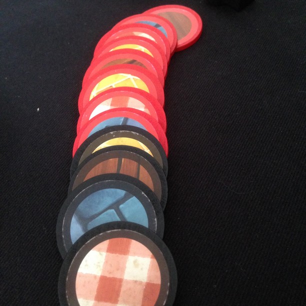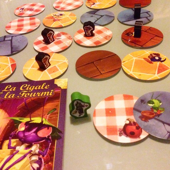 Le mécanisme central du jeu est le guessing (et donc le bluff…). Sur un terrain de 4×4 cartes (cartes rondes représentant 4 types de chemins/terrains différents), le joueur fourmi va y déposer 6 meeples fourmi : les fourmis se suivent d’une carte à l’autre, en commençant par le bord et ne connaissent que les déplacements orthogonaux. Une fois la colonie placée, le joueur fourmi choisit grâce à ses jetons (de type poker) le type de carte et donc de terrains qu’il souhaite amasser. Il met alors son jeton face caché. C’est là que la cigale aussi fourbe que cruelle va venir se positionner sur une des cartes où se trouve une fourmi. Après révélation, si la cigale s’est trompée, la fourmi empoche toutes les cartes correspondantes à son choix (où elle avait déposé un de ses congénères). Si la cigale a flairé bon, c’est alors elle qui s’empare de la moisson.