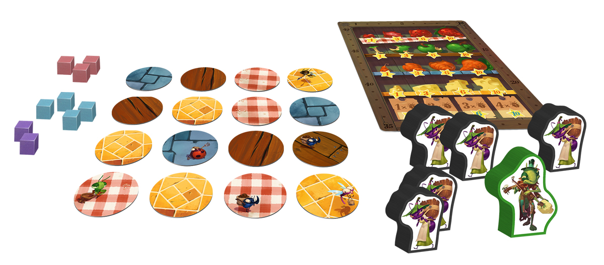 – j’ai rarement dessiné des insectes, mais j’étais très motivé alors je ne me suis pas trop posé de question et je me suis lancé. C’était également pour moi l’occasion de faire des petits animaux rigolos et très stylisé. Il y avait des éléments vraiment très différents à réaliser, les insectes, les tuiles de texture (sol), les illustrations avec la fourmi, le plateau de score avec les aliments (c’est l’élément que j’ai préféré réaliser). Il s’agit d’un jeu de taille moyenne, et je me suis beaucoup amusé à faire ces illustrations, alors ça ne m’a pas paru long.