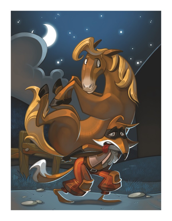 J’avais très peu l’expérience de telles illustrations : j’ai vraiment beaucoup appris en travaillant dessus. La feinte a été de garder la saturation mais sur des mauves et les bleus (qui sont les couleurs habituelles de la nuit) et de coloriser les animaux comme s’ils étaient en plein jour pour les détacher du fond, avec des ombres plus appuyées. Encore aujourd’hui je pense que le résultat est perfectible, mais j’espère avoir réussi à restituer malgré tout un peu du « punch » et du côté acidulé des colos que j’ai l’habitude de faire en plein jour.
