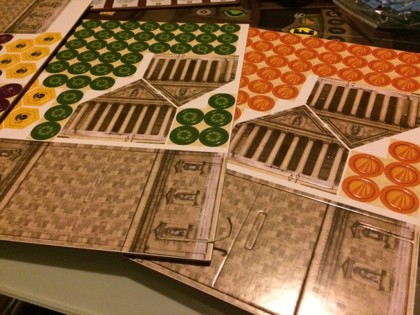 – Le plateau, il me faisait peur à la première vue mais il a l’air plutôt bien pensé pour un jeu de « gestion » de ressources. Je trouve aussi l’idée de la tirelire/bank sympa même si ça sent le gadget.