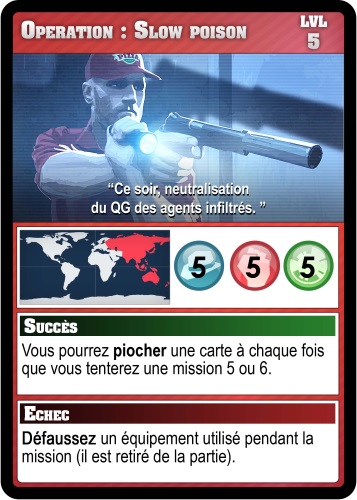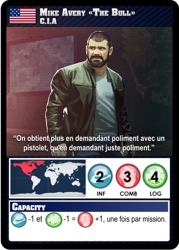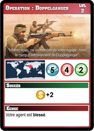 Je suis venu présenter Spy Wars aujourd’hui. IL s’agit d’un jeu de cartes, de type deckbuilding, se déroulant dans l’univers des agents secrets. Chaque joueur incarne un agent d’un pays, le but du jeu est de gagner le maximum de points de victoire en réussissant des missions disséminées à travers le monde. Mais gare aux autres agents qui pourront les intercepter ou leur mettre des bâtons dans les roues, car tous les coups sont permis ! Chaque agent dispose d’un pouvoir spécial et de 3 compétences : Infiltration, Combat et Logistique. Pour réussir une mission, il faudra battre deux de ses trois scores de défense. Chaque joueur va construire son deck en achetant au fur et à mesure des cartes d’équipement ou d’action au marché noir. A chacun de choisir sa stratégie pour remporter la victoire finale !