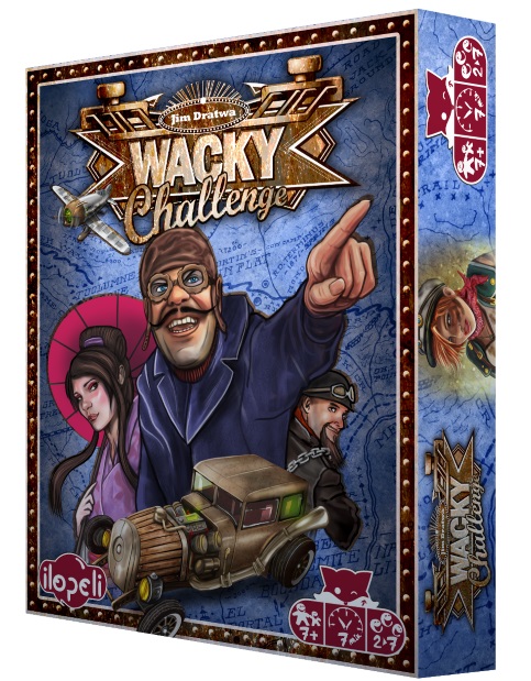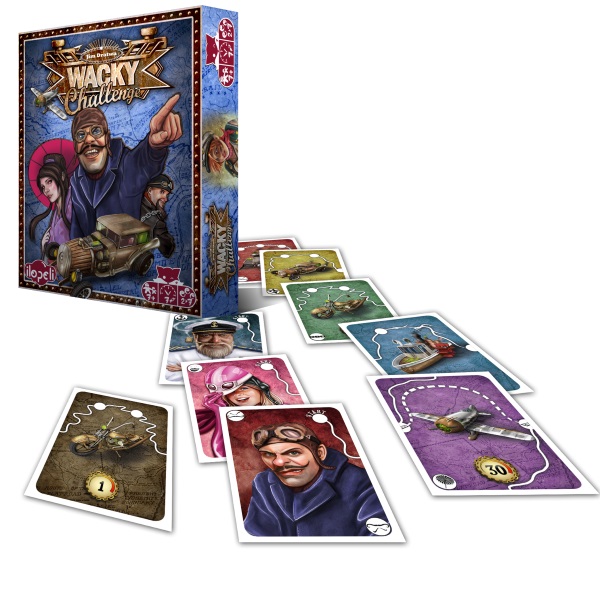 Wacky Challenge est la dernière production des studios Ilopeli, signé par Jim Dratwa et illustré par Ismaël Pommaz. Ce petit jeu de cartes possède des caractéristiques assez spécifiques : il se joue de 2 à 7, dès 7 ans, en 7 minutes seulement. A ce prix, ça sent le jeu rapide et malin, accessible à tous et qu’on emmène partout… L’est il réellement ?