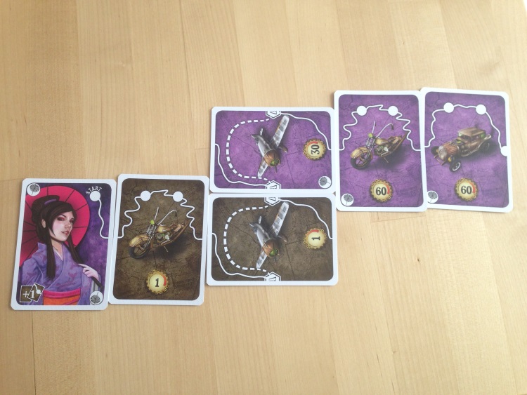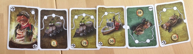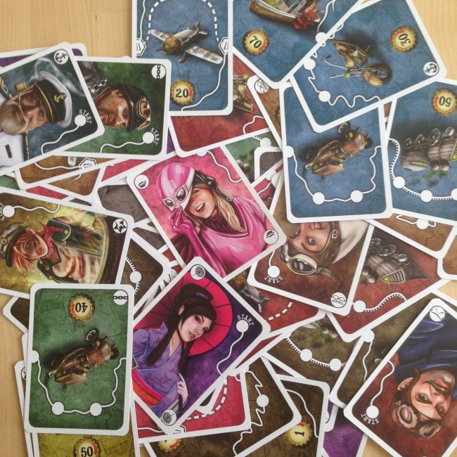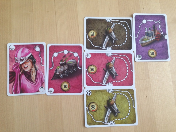 – les cartes qu’ils vont pouvoir récupérer : en effet, le but du jeu est de totaliser le plus de points. Sur chaque carte, un parcours est représenté ainsi que des ronds constituants des étapes. Chaque étape valant un point. Les cartes trains possèdent 3 étapes donc 3 points, tandis que le bateau en possèdent une et demi… une deuxième moitié sera donc nécessaire pour valider cette étape. Les cartes ainsi récupérées vont être posées face visibles à coté de votre carte « joueur » pour former votre parcours,