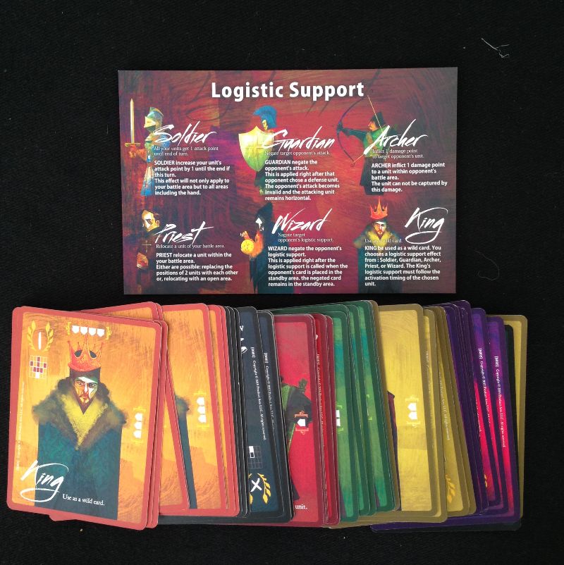 L’aléatoire de pioche n’est pas vraiment gênant car il y a peu de cartes dans le decks et la composition est connue. De plus les règles une fois bien acquises, permettent de moduler la répartition de vos troupes à votre gré. Vous pouvez jouer avec plus de magiciens et d’archers, ou sans prêtres, ou comme vous voulez vraiment, si votre façon de jouer s’y prête ou si vous voulez tester une certaine stratégie. Cela aide vraiment à la diversité des parties et la personnalisation du jeu en fonction des envies de chacun. Toutefois cela engendre le problème de posséder une boite chacun si les deux joueurs veulent jouer avec 7 soldats par exemple. La boite contient de nombreux rois différents. Les caractéristiques d’attaque, de puissance et de défense varient beaucoup et cela permet également un bon renouvellement des parties.