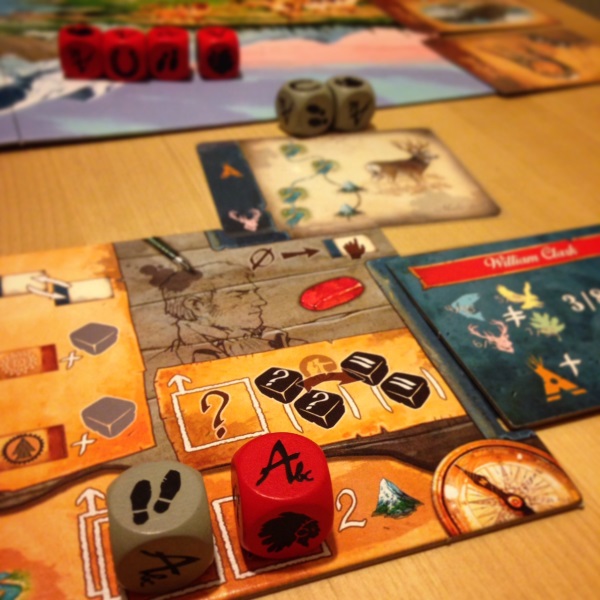 Votre plateau de jeu vous permet de stocker vos dés, d’effectuer un grand nombre d’action en plaçant vos dés, et de constituer votre manuscrit grâce aux cartes explorations déjà réalisées. Ces actions vous permettent de changer votre exploration en cours par une des trois présentes sur le plateau central, de parlementer avec les indiens (3 au centre également), de modifier vos dés (très, très, très important), et d’effectuer une progression en rivière ou en montagne.