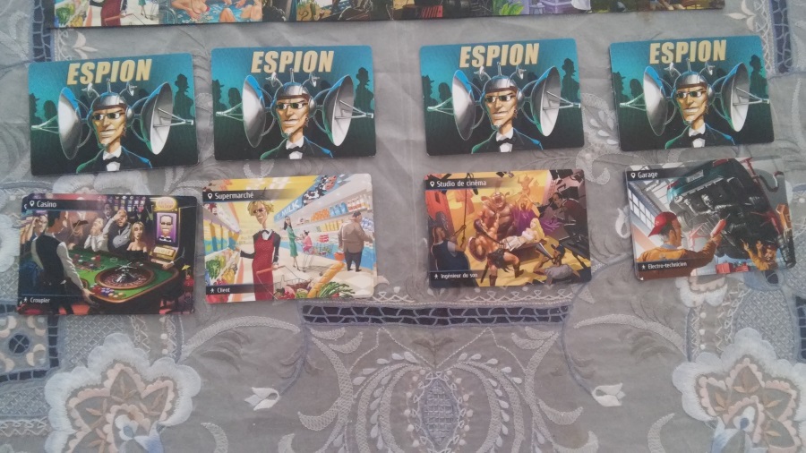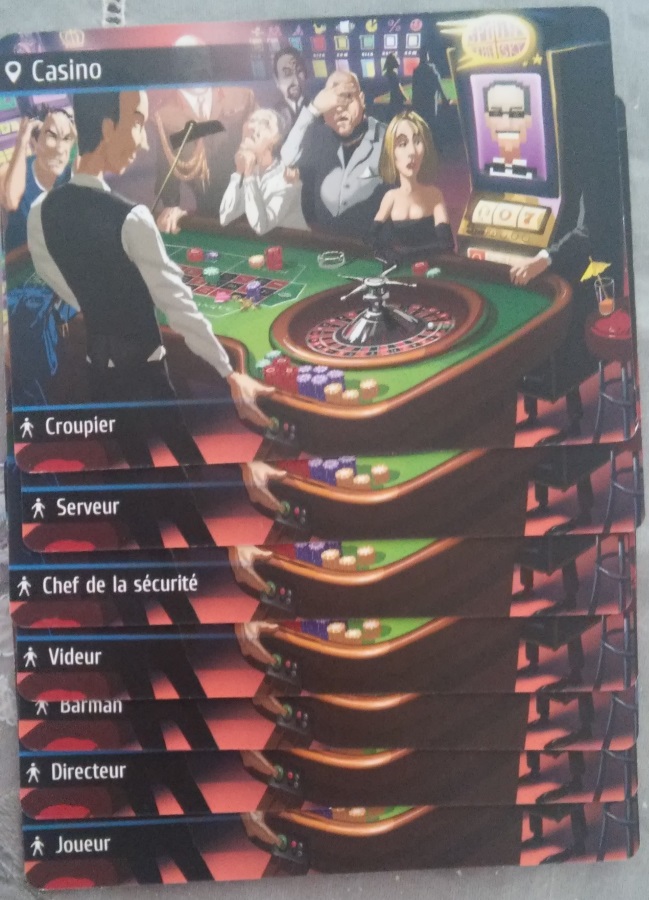 • 220 cartes lieux (7 cartes identiques pour chacun des 30 lieux proposés dans le jeu). On y retrouve par exemple : un paquebot, un train, un théâtre, un centre de Thalasso, Une fête d’entreprise, etc. De plus, pour ajouter un côté « roleplay » si les joueurs le souhaitent, chaque carte lieu contient également un type de personnages (Exemple : Barman, acrobate, etc.).