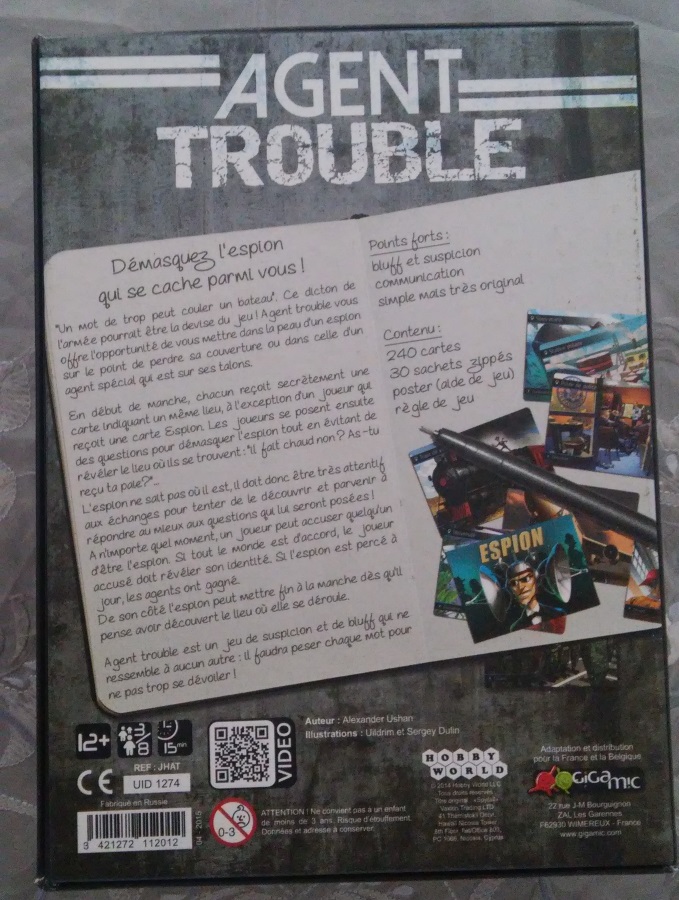 Agent Trouble est un jeu de communication et de bluff tout droit sortie de l’imagination d’Alexander Ushan. Il s’agit de la version française de SpyFall éditée à l’étranger par Hobby World. Dans Agent Trouble, tous les joueurs sont des espions… mais l’un deux est un agent double ! Le but pour les espions consiste à démasquer le traitre alors que ce dernier aura pour objectif de découvrir dans quel lieu il se trouve.