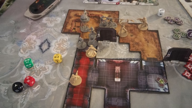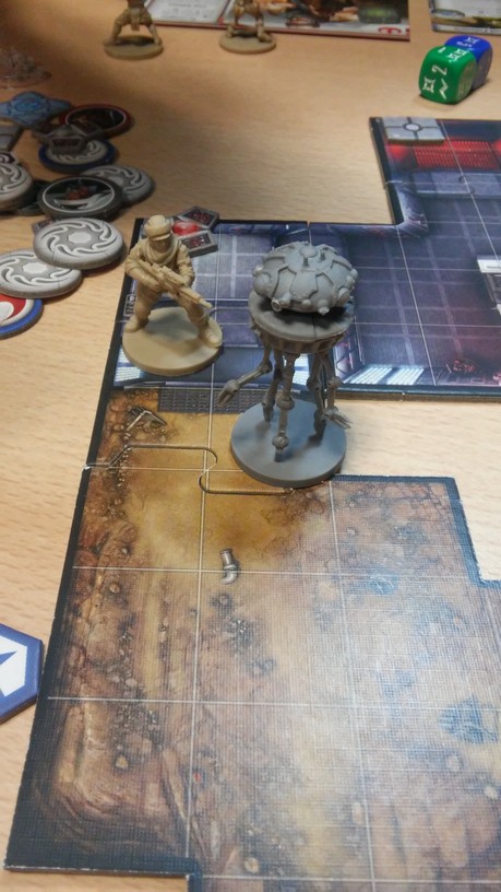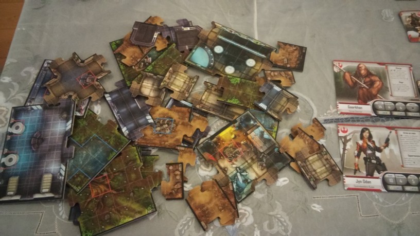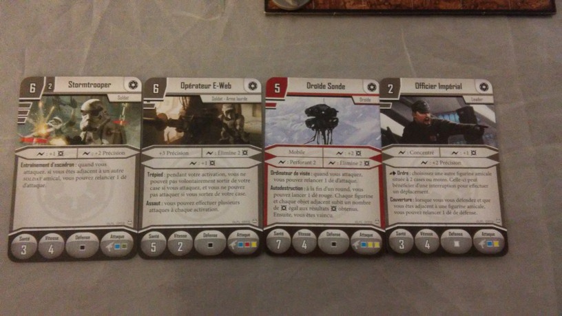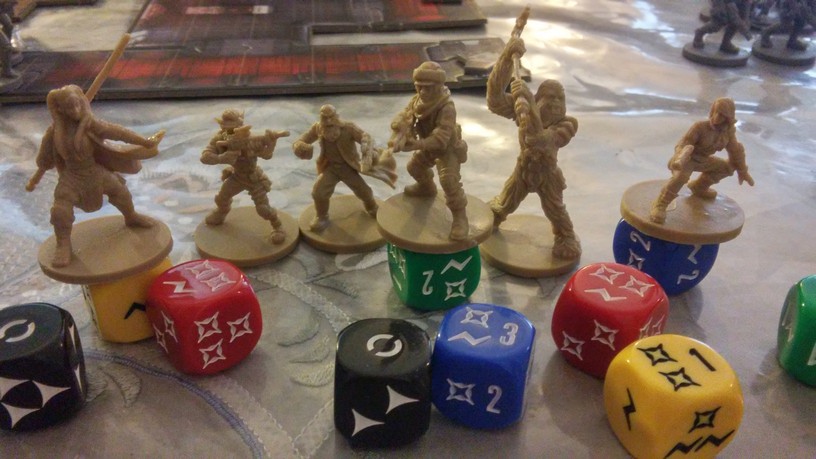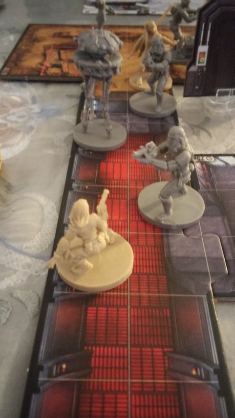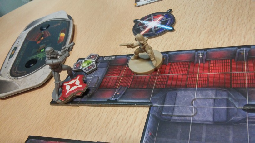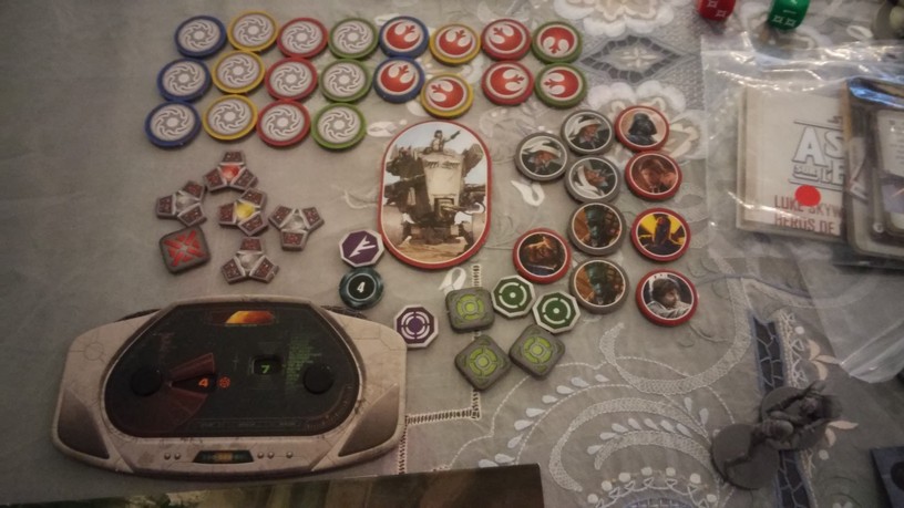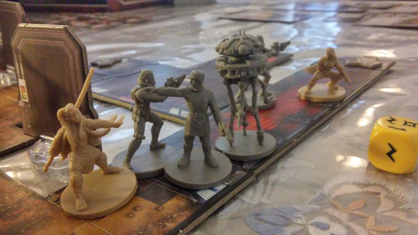 Après la mise en place des tuiles créant l’aire de jeu de la mission choisie par les joueurs, chacun dispose également ses figurines (rebelles et Impériales). La partie peut alors débuter. Chacun des Rebelles est incarné par un seul joueur alors qu’un autre se charge de l’ensemble des figurines Impériales. Généralement, les Rebelles sont plus forts mais moins nombreux que les Impériaux. Un joueur Rebelle va activer sa figurine en lui attribuant 2 actions possibles (se déplacer, combattre, interagir avec le décor, se reposer, etc.). Puis c’est au joueur Impérial d’attribuer 2 actions à l’une de ses figurines. Lorsque toutes les unités en jeu ont été activées, un nouveau round commence. Suivant la mission, il est possible que le nombre de rounds soit limité : il va donc falloir agir vite et de façon tactique. Les combats se déroulent à l’aide de dés. En fonction de l’arme utilisée par la figurine, on jette des dés de couleurs spécifiques. Ceux-ci font apparaître des dégâts mais aussi de l’adrénaline (permettant de renforcer l’attaque en la rendant plus précise ou plus dévastatrice par exemple). Après l’attaquant, c’est au défenseur de lancer son dé de défense pour savoir s’il esquive tout ou partie de l’assaut. Une mécanique simple donc mais qui demande tout de même un temps d’adaptation. En effet, il faut prendre soin de bien comprendre de l’iconographie des dés ainsi que des effets possibles grâce à l’adrénaline récoltée. Chaque camp à un objectif à remplir afin de savoir qui remportera la partie.