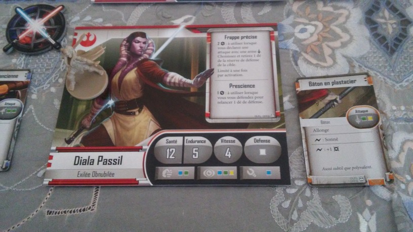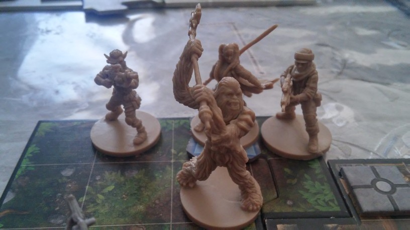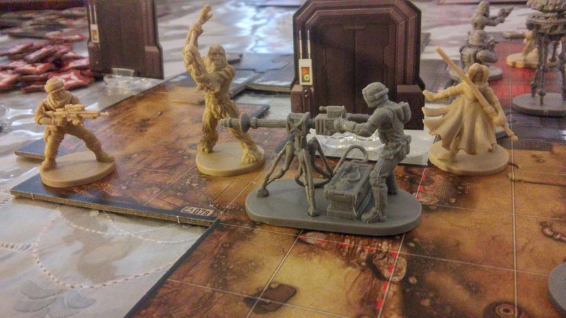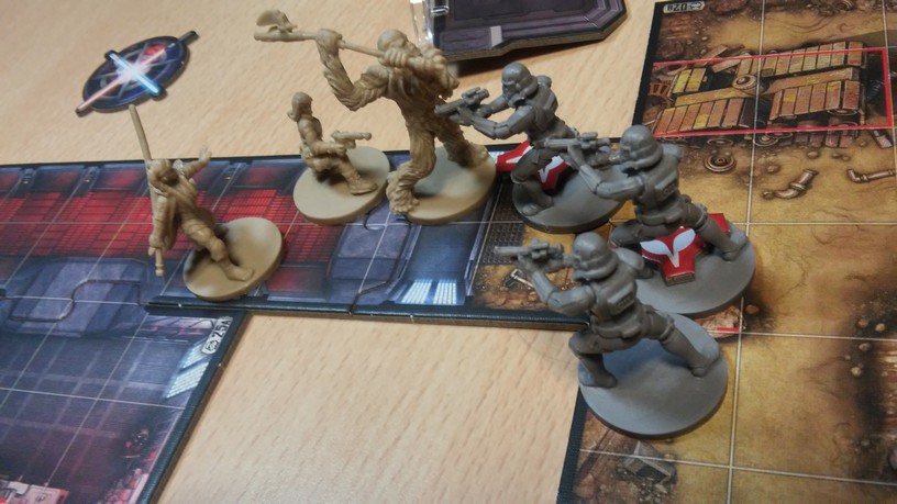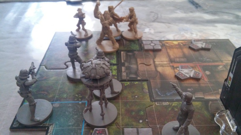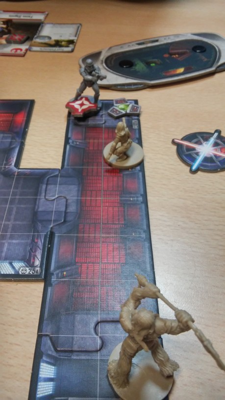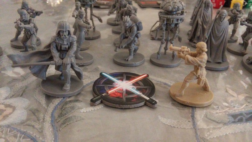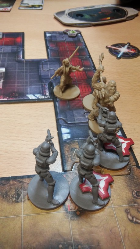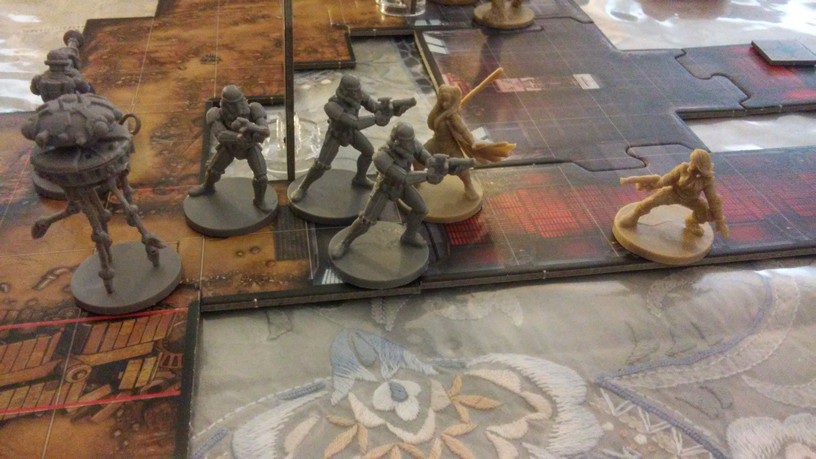 Après la mise en place des tuiles créant l’aire de jeu de la mission choisie par les joueurs, chacun dispose également ses figurines (rebelles et Impériales). La partie peut alors débuter. Chacun des Rebelles est incarné par un seul joueur alors qu’un autre se charge de l’ensemble des figurines Impériales. Généralement, les Rebelles sont plus forts mais moins nombreux que les Impériaux. Un joueur Rebelle va activer sa figurine en lui attribuant 2 actions possibles (se déplacer, combattre, interagir avec le décor, se reposer, etc.). Puis c’est au joueur Impérial d’attribuer 2 actions à l’une de ses figurines. Lorsque toutes les unités en jeu ont été activées, un nouveau round commence. Suivant la mission, il est possible que le nombre de rounds soit limité : il va donc falloir agir vite et de façon tactique. Les combats se déroulent à l’aide de dés. En fonction de l’arme utilisée par la figurine, on jette des dés de couleurs spécifiques. Ceux-ci font apparaître des dégâts mais aussi de l’adrénaline (permettant de renforcer l’attaque en la rendant plus précise ou plus dévastatrice par exemple). Après l’attaquant, c’est au défenseur de lancer son dé de défense pour savoir s’il esquive tout ou partie de l’assaut. Une mécanique simple donc mais qui demande tout de même un temps d’adaptation. En effet, il faut prendre soin de bien comprendre de l’iconographie des dés ainsi que des effets possibles grâce à l’adrénaline récoltée. Chaque camp à un objectif à remplir afin de savoir qui remportera la partie.
