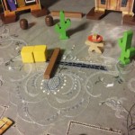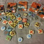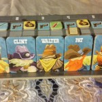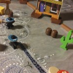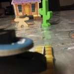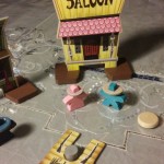 Sans entrer dans le détail des règles, Flick’em Up utilise donc la méthode dite du « pitch » pour réaliser 2 actions parmi les suivantes : déplacer l’un de ses cowboys, interagir avec un bâtiment et/ou tirer sur le 1er Pied Tendre venu ! Chaque action est donc rapidement réalisée à l’aide d’un palet et les tours de jeu s’enchaînent facilement. Les règles sont assimilées d’autant plus aisément que les 10 scénarii inclus proposent un apprentissage progressif [qui n’est pas obligatoire, sans on s’éclate aussi]. La mise en place est assurée à chaque fois par un dessin explicatif et les points de règles propres au scénario choisi sont détaillés. Une fois la mise en place (relativement rapide) réalisée, la partie démarre pour 45 minutes d’une ambiance « Western » mais surtout moqueuse lorsque son adversaire rate totalement son lancer de palet. Attention, cependant, ce jeu impose vraiment d’avoir une surface bien plane pour jouer. De plus, bien que le jeu soit annoncé comme étant jouable jusqu’à 10 joueurs, je vous conseille vivement de limiter sa pratique à 4 joueurs maximum afin de ne pas perdre en dynamisme.