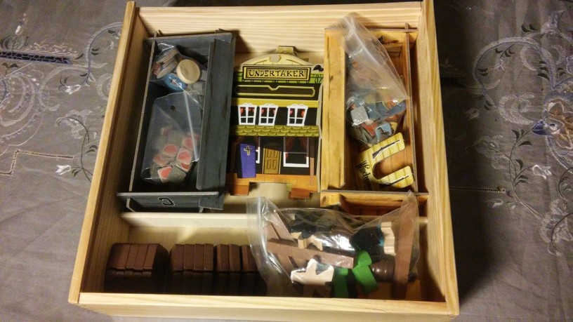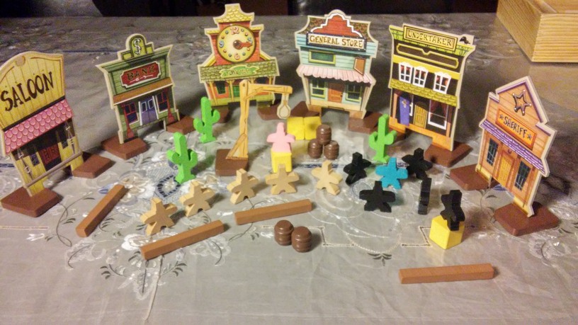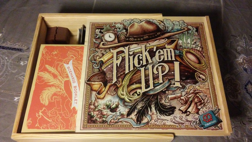 La boite de Flick’Em Up offre déjà une belle surprise : elle est en bois ! Le couvercle coulisse et fait apparaître un matériel pléthorique composé : de 12 figurines de cowboys/malfrats avec leur chapeau « d’activation », 6 superbes bâtiments (Saloon, Shérif, General Store, etc.) accompagnés d’une potence (!), 36 éléments de décors en bois (cactus, barils, etc.) et divers jetons. De plus, un livret de règles et un autre consacré scénarii est inclus dans la boite. L’édition de ce jeu donne tout de suite envie de jouer !