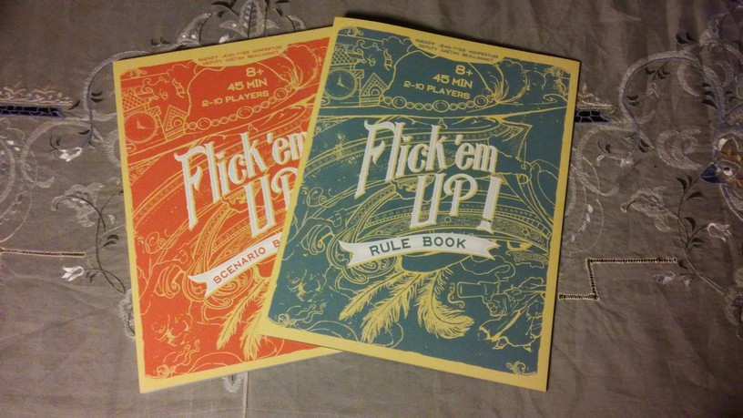 Clairement, Flick’Em Up est un jeu efficace pour peu que l’on ne soit pas allergique aux jeux de pitch. Simple et bénéficiant d’un matériel en bois du plus bel effet, le jeu permet de se détendre en famille ou entre adultes sans se prendre la tête. Bien plus que la mission à accomplir par le scénario choisi, le plaisir de jeu viendra surtout des coups improbables réalisés par erreur ou des lancer de palet totalement ratés! On rira de ses adversaires, on se désolera de ses tires complétement manqués… Bref, on s’amusera ! 😉 Attention cependant, le jeu n’est vraiment bon que de 2 à 4 joueurs. Les autres configurations créent un temps d’attente trop long pour chaque joueur entre 2 tours. Il faudra également surmonter le prix de la boite (même si celui-ci se justifie par son matériel en bois et le renouvellement des parties assurées par son livret de scénarii). Il s’agit donc d’un jeu simple, fun et dynamique que l’on peut recommander sans retenu si vous aimez les jeux de pitch et l’ambiance moite des films de western.