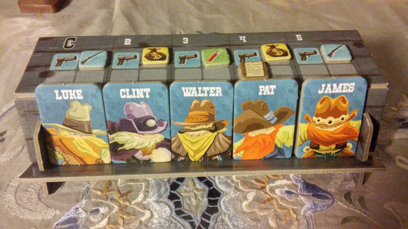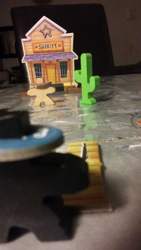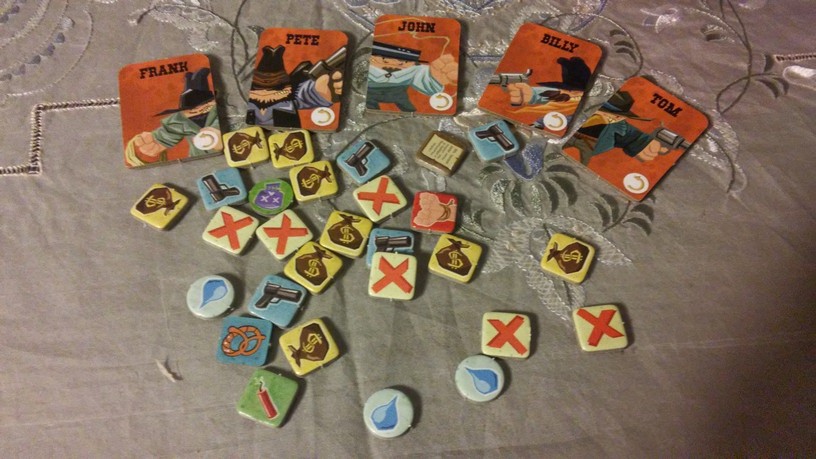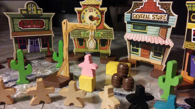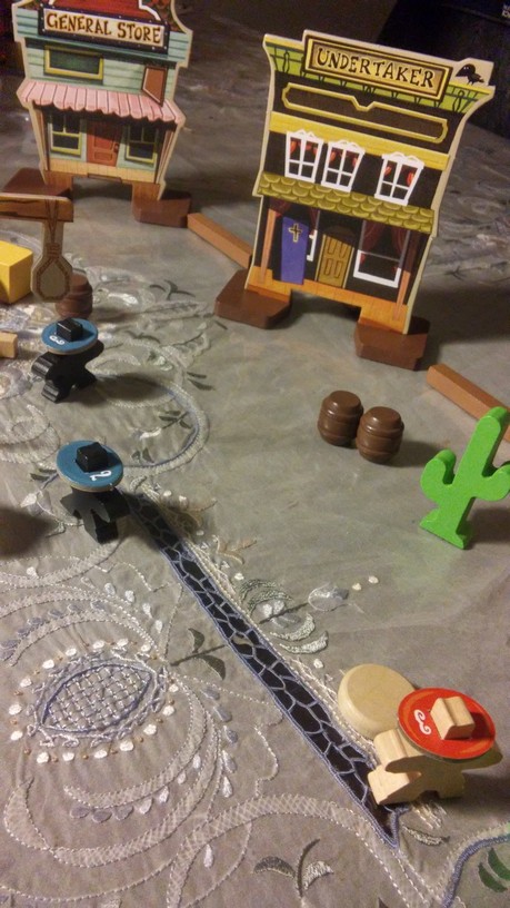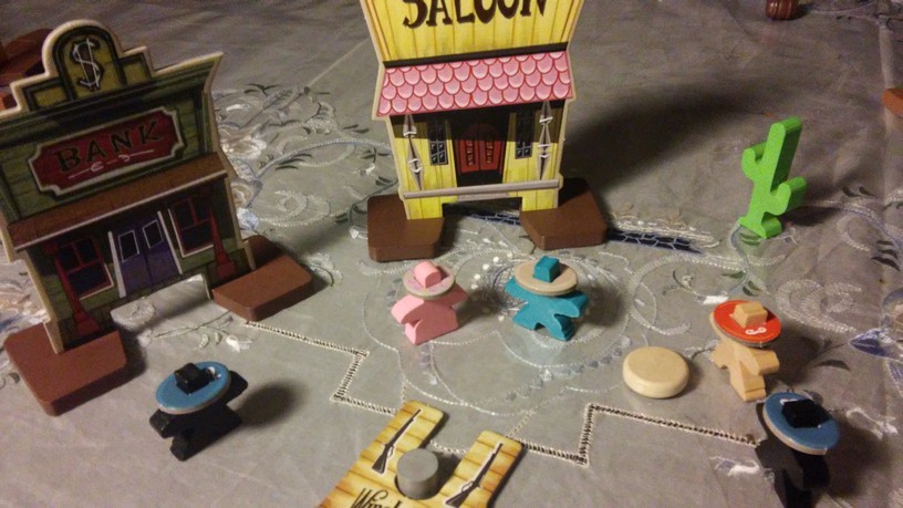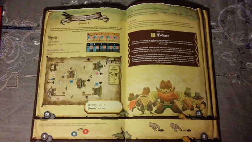 Sans entrer dans le détail des règles, Flick’em Up utilise donc la méthode dite du « pitch » pour réaliser 2 actions parmi les suivantes : déplacer l’un de ses cowboys, interagir avec un bâtiment et/ou tirer sur le 1er Pied Tendre venu ! Chaque action est donc rapidement réalisée à l’aide d’un palet et les tours de jeu s’enchaînent facilement. Les règles sont assimilées d’autant plus aisément que les 10 scénarii inclus proposent un apprentissage progressif [qui n’est pas obligatoire, sans on s’éclate aussi]. La mise en place est assurée à chaque fois par un dessin explicatif et les points de règles propres au scénario choisi sont détaillés. Une fois la mise en place (relativement rapide) réalisée, la partie démarre pour 45 minutes d’une ambiance « Western » mais surtout moqueuse lorsque son adversaire rate totalement son lancer de palet. Attention, cependant, ce jeu impose vraiment d’avoir une surface bien plane pour jouer. De plus, bien que le jeu soit annoncé comme étant jouable jusqu’à 10 joueurs, je vous conseille vivement de limiter sa pratique à 4 joueurs maximum afin de ne pas perdre en dynamisme.