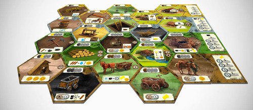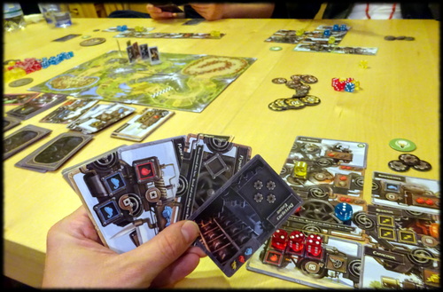 J’ai cru voir Suburbia à un moment, du coup j’ai passé mon chemin (ce jeu est très bon sur iPad mais épuisant sur table). Et finalement, je suis allée plus loin suite au petit buzz et j’avoue être assez séduite. Les joueurs vont acquérir les connaissances nécessaires, agrandir leur ferme et creuser plus profond pour obtenir plus de charbon. A surveiller donc 🙂