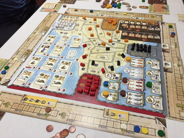 C’est la couverte du jeu qui a retenu mon attention. C’est aussi, comme the gallerist, un jeu à base d’investissement (acheter et vendre) du coup je ne pense pas repartir avec les deux (ou alors je serai folle, ce qui est très possible, vu que c’est mon premier Essen). Je voulais l’enlever de la liste jusqu’à ce que Yann (de Matagot) qui a les mêmes goûts que moi me dise qu’il était très bien! Donc voilà j’irai jeter un coup d’oeil et pas qu’un car ce jeu rappelle Russian Railroads (selon un joueur de BGG, indiqué sur le forum TT). Mais je ne vois rien de Russian Railroads en terme de mécanique puisque ce sont des cartes jouées qui donnent les actions et non du placement d’ouvriers (j’aime le placement d’ouvriers :p) Après, les actions sont principalement d’acheter des cartes ou investir dans les sociétés. Je demande à voir.