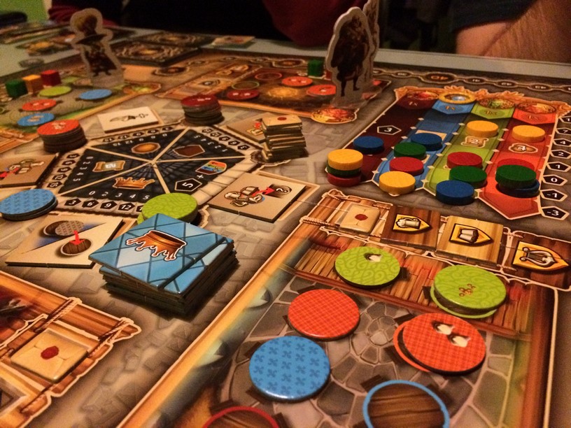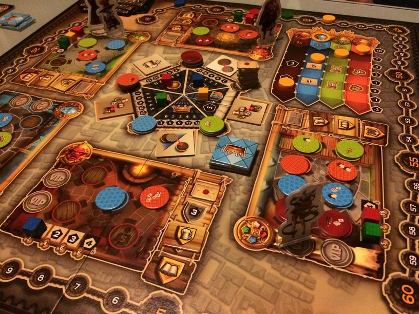 C’est en soirée presque froide qu’on a décidé de sortir Taverna à 4 (2 joueurs connaissaient déjà). J’avais apprécié la TT TV, j’aime les GAG et puis les dessous de verre et le sac étaient une excellente idée de goodies ! Mais revenons au jeu. Dans Taverna, vous placez des clients à des tables dans les tavernes que vous possédez en commun ou non. Selon le type de client, le type de table où vous le placerez et ce qu’il veut, vous allez jouer sur différents tableaux et faire monter votre score mais comme si ça suffisait pas, vous pourrez, en plus, utiliser un notable qui est dans la taverne au moment où vous placerez vos clients. Il y a donc plein de combos et de choses à faire, mais vous n’avez que 6 tours, 6 minuscules tours pour espérer remporter la victoire! et croyez moi c’est serré ! Malgré les cartes clients aléatoire, c’est un excellent jeu, une excellente idée, un jeu tendu avec un goût de reviens y assez important. Bref, que faites vous encore là ? foncez le chercher !!!